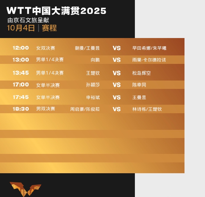 10月4日,中国大满贯2025年WTT继续进行。中国网球乒乓球型网球盖网球时间网球网球网球一起网球。 12:00 Women's Double Final Quayman/Wan Manyu vs Hayata Xina/Zhuxxi 13:00 Men's Singles Square Final Xiang Peg vs Hugo Caldorano 13:45 Men's Singles Square Final Wang Chukin vs Songdao Huikong 17:00 Women's Sun Yingsha Yings Final Zhou Qihao/Chen Junsheng vs Lin Shidong/Wang Chuqin