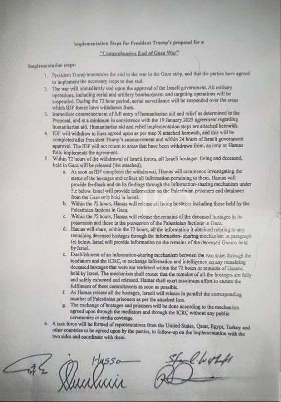 当地时间9日晚,以色列公共广播公司Kan Broadcasting公布了以色列、哈马斯和调解人在埃及签署的关于释放被拘留者和结束加沙冲突的协议副本。本文件详细介绍了协议的不同部分。首先,美国总统特朗普“宣布加沙地带战争结束,各方同意为此采取必要措施” ・第二部分称“一旦以色列政府批准,战争将立即结束”。以色列政府目前正在开会对该协议进行投票,所有军事行动将暂停。 · 第 3 部分呼吁“立即启动对加沙地带的全面人道主义援助和救济”。第4部分规定“以色列国防军将撤至所附地图所示的商定路线”。下一条规定,“在哈马斯释放所有被拘留者的同时,以色列将释放相应的根据调解员与红十字国际委员会商定的机制,交换被拘留者将在不举行公开仪式或媒体报道的情况下进行。“将成立由美国、卡塔尔、埃及、土耳其等双方商定国家代表组成的工作组,负责后续协调双方的落实工作。”(总台记者李) 翔)