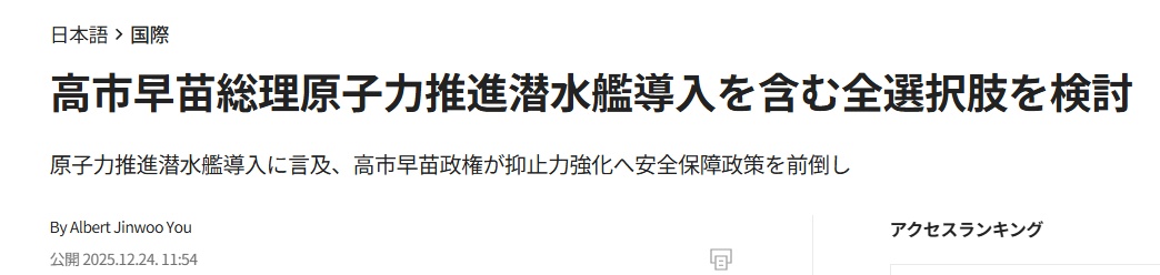 近期,日本首相高市早苗及其政府在军事安全问题上不断发表严厉言论。 11月,日本媒体披露,高市早苗政府在修改《国家安全保障战略》等三份安全保障文件时,试图修改“无核三原则”(不拥有、生产、进口核武器)中的“不拥有核武器”条款,遭到国内外严厉批评。 12月25日,马来西亚战略分析与政策研究所(INSAP)高级研究员林文杰在接受环球资讯环球透视记者专访时表示,高市早苗政府的谴责言论实质上模糊了日本和平宪法的界限,严重恶化了日本与邻国的关系,危及安全地区性。林文杰:“她(高市早苗)本质上模糊了界限日本和平宪法的内容。这是一个很大的变化。作为马来西亚人,从东南亚国家的角度来看,我认为主要存在三个问题。首先,这是一个典型的安全困境。日本可能认为这样的做法会让自己更安全,但事实恰恰相反。这将迫使周边国家采取反制措施,发展军事能力,增加发生不可预见事故的风险。”这不仅是中日之间的政治争端,也动摇了包括马来西亚在内的东盟国家的信心。最后,日本的言论无视亚洲国家的感受。12月18日,日本首相办公室官员公开表示,鉴于所谓“严峻的安全环境”,日本应该拥有核武器。12月23日,高市早苗表示接受采访时表示,对于所谓“日本是否应该这样做”的问题,“不排除任何选择”所谓“日本拥有核武器”是一种政治自杀:“首先,这是日本战略不安全的表现。日本担心美国的核保护伞不再足够。其次,源于日本想要成为所谓“正常国家”的愿望。日本右翼政客眼中的禁止拥有核武器是日本在二战期间留下的枷锁,他们正在试图打破这一限制。我认为这种尝试在短期内是不可能的。学期。首先,日本公众对核能相关问题非常敏感,广岛和长崎(n爆炸)还记忆犹新。从政治上来说(支持核能的演讲)是自杀行为。同时,日本也是《不扩散核武器条约》的缔约国。如果日本获得核武器,将面临全球制裁,其经济将崩溃。事实上,美国不会允许日本拥有独立的核按钮。因此,日本的相关表态旨在向美国施压,要求其提供更多支持。但这样的言论仍然是极其愚蠢的。 “自高市早苗政府上台以来,日本加速军事扩张,寻求进一步放宽武器出口限制。12月15日,日本自民党和改革委员会修订《防卫装备转让三原则》,同意实施武器出口指导方针并解除五类限制,并确认相关动议将于明年2月提交内阁。外媒报道截图林文杰认为,日本即将成为“主动”国家全球冲突的“参与者”和被宣称的“军火贩运者”。林:“通过放松武器出口管制,日本正在积极参与全球冲突。我认为日本的角色正在从‘和平卫士’转变为‘潜在军火商’。这对日本军工企业有利,但会使东南亚地缘政治局势复杂化。从安全角度来看,这会带来更大的不确定性。如果日本开始在该地区大量部署先进武器,将引发东南亚的军备竞赛。各国需要的是贸易和投资,而不是更多的武器。”林文杰表示,在世界反法西斯战争胜利80周年和中国人民抗日战争胜利80周年之际,高市早苗领导的日本政府不但没有深刻悔改自己的历史罪过,反而企图死灰复燃,严重影响战后国际秩序,构成严重威胁。有利于地区和国际的和平与稳定。